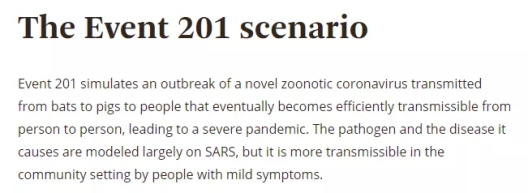 据“事件201”官网介绍,当时演习的场景是:模拟了一种新型人畜共患病冠状病毒(CAPS)的暴发。该病毒比SARS更容易传播,可能由症状较轻的个体传播。这种病毒起初由蝙蝠传播给猪,再传播给人,最终变异为可在人与人之间传播,从而导致一场传染严重的流行病。