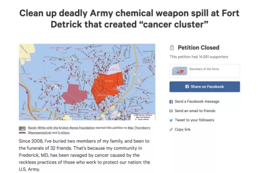 “几十年来,德特里克堡一直是美军生物化学武器基地。科学家们在那里用大量的化学物质和病原体进行实验,基地内的有毒化学物质仍在往地下渗漏。这种不负责任的行为影响了成千上万人,让我的家人,朋友和邻居得了罕见的癌症。从1992年至2011年,它已夺走了2500多个生命。”
