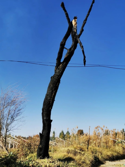 林场内一颗被烧焦的胡杨树孤零零矗立在葡萄园里。(记者李金红摄)