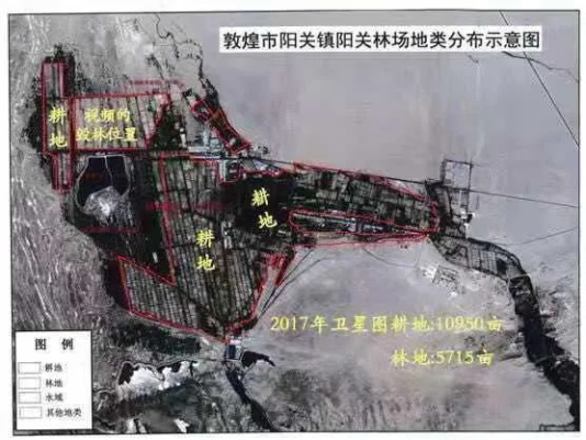 图为记者获得两张由权威部门制作的卫星遥感影像图片,一张为2000年阳关林场林地原貌图,显示其防护林面积约为2万亩;另一张为2017年阳关林场地类分布示意图,显示林地面积只有5千亩,葡萄种植面积则达万亩以上。