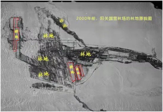 《经济参考报》记者获得两张由权威部门制作的卫星遥感影像图片,一张为2000年阳关林场林地原貌图,显示其防护林面积约为2万亩;另一张为2017年阳关林场地类分布示意图,显示林地面积只有5000亩,葡萄种植面积则达万亩以上。