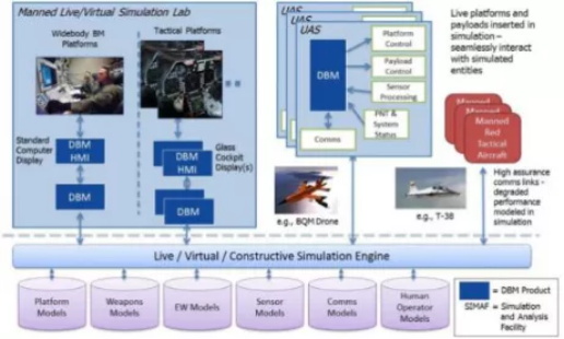 2018年1月,DARPA已向BAE系统公司授予DBM项目第三阶段合同,前两阶段发展的成果能让有人/无人机编组在干扰环境中飞行,具备回避威胁和攻击目标的能力。图3是DBM项目的能力验证环境。