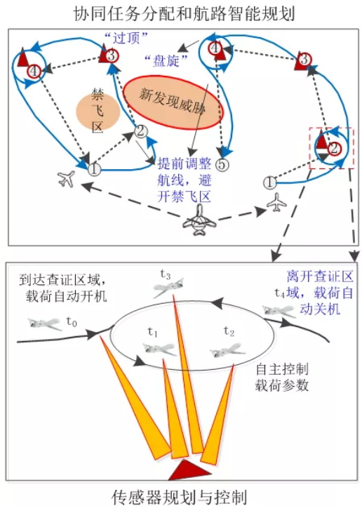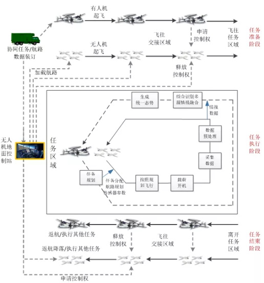 有人机根据当前战场态势信息,分配各个无人机的作战任务,并对无人机的航线和传感器进行规划。无人机在有人机的指挥下,按照规划结果执行飞行任务,抵达目标区域后,传感器开机。有人机上的操作人员对无人机传感器进行控制,无人机负责采集并回传目标情报至有人机。通过多源情报综合处理,形成新的态势信息,为有人机的进一步决策提供依据。