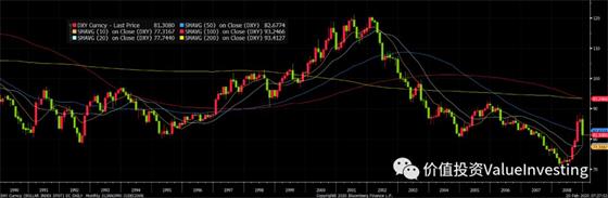 我们把时间锁定2008年,看看为什么2008年金融危机,美联储QE,美元没有贬值反而升值了?看图表,美元从2001年开始走贬值周期,贬值趋势一直到次贷危机前的2007年,6年贬值幅度达40%。危机来了,避险模式启动,美元长期空头平仓盘成为美元买盘的主动力。市场中所谓的避险行为就是投资人了结现有投资部位的举动。之前美元是空头趋势,很多投机资本做空美元,危机来了,美元空头的避险动作就变成买入美元。这就是为什么2008年金融危机,美联储QE,美元没有贬值反而结束了贬值趋势的市场原因。