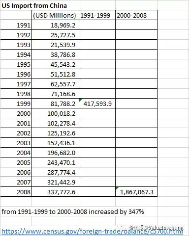 2000年是中国融入全球化的元年,人民币和美元软挂钩,中国和亚洲廉价产品源源不断流入美国,稳定了美国通胀。现在人民币和美元脱钩,当美元贬值周期再次到来,人民币对美元也将升值。如今中国已经不是廉价劳动力资源国,亚洲产能又无法替代中国的供应总量,可以预见,这次美元贬值周期到来时,美国通胀就无法淡定了。看美国从中国进口的规模,也佐证了美国能通胀稳定,中国功不可没。(附件4: 美国自中国进口1991-2008)