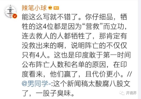 他叫嚣“能这么写就不错了,你仔细听,牺牲的这4位都是因为营救而立功,连去救人的都牺牲了,那肯定有没救出来的啊,说明阵亡的不仅仅只有4人。这也是印度敢于第一时间公布阵亡人数和名单的原因,在印度看来,他们赢了,其代价更小。”