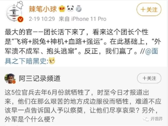 比如,一名粉丝多达254万的知名博物博主@辣笔小球 就在今天上午10时29分发布诋毁、告诉我边防部队、诬蔑我牺牲的烈士和受伤的团长的帖子: