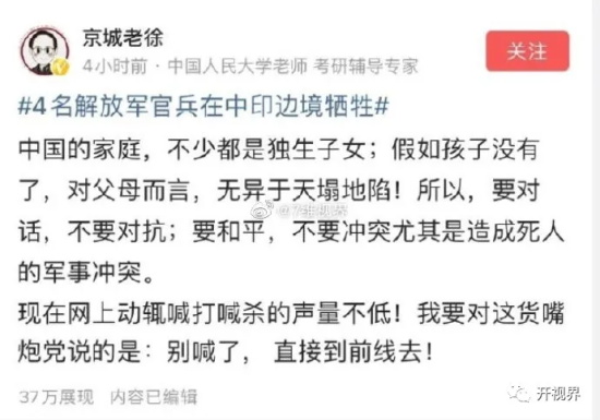 如认证为“中国人民大学老师、考研辅导专家”的“京城老徐”,在这个时候充当起了理中客,一个劲儿的大叫“和平”,对于支持我前线边防部队的人扣上“嘴炮党”的帽子。