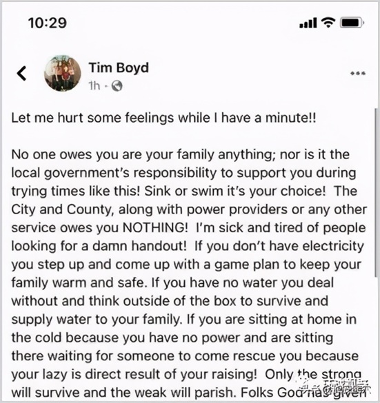 正是在这种指导思想下,美国新冠会死那么多人,寒流来袭击,美国市长却发出冷血言论,议员在人们饥寒交迫时去度假休闲,也就不用奇怪。
