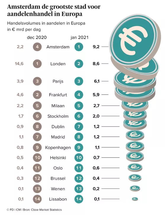 (英、欧主要城市日均证券交易量(十亿欧元),2020年12月 VS 2021年1月。图片来源:Het Financieele Dagblad)