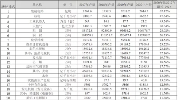 可以很清楚的看到,集成电路是我国过去四年产量增长最快的工业品,2020年比2017年增长了67.12%。