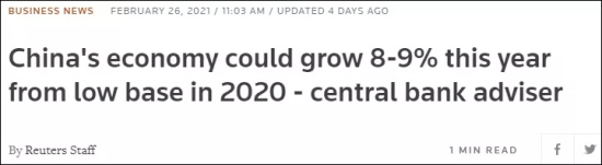 事实上,中国的经济发展,影响的永远不仅仅只有几个特定国家,同时也牵动着全球经济的脉搏。世界银行前首席亚洲经济学家霍米·哈拉斯(Homi Kharas)就表示,在过去的20年里,全球经济增长平均每年受到来自中国约0.8%的提振和推动,而如果单论去年的表现,中国对全球经济的提振作用扩大了近一倍,据他估算约为1.5%。2月26日,路透社援引全国政协经济委员会副主任、中国人民银行货币政策委员会委员刘世锦的观点称,随着中国经济在疫情中继续反弹,2021年中国GDP增长率可能在8%至9%之间。他认为,2020年和2021年的平均GDP增长率若能达到5%左右,这将会是一个不错的结果。