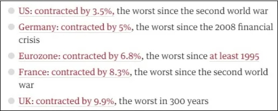 1709年,一场大霜冻席卷全欧,持续的低温导致粮食短缺,庄稼枯萎,牲畜被冻死在谷仓里,人们也难以幸免。与之一起到来的,还有西班牙王位继承战争(1701年至1714年)。糟糕的气候,加上战乱的影响,1709年英国GDP下降了13.4%,1710年下降了9.1%。对此,英国媒体《卫报》特意列出其他国家和地区,与英国经济情况的对比。美国2020年GDP萎缩了3.5%,德国萎缩5%(已修正为4.9%),法国萎缩8.3%,欧元区萎缩6.8%,都没有英国的严重。