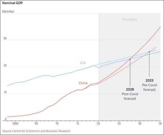 “中国经济在疫情期间的优异表现,将使得(中美之间)差距缩小。”瑞银集团(UBS)董事长韦伯(Axel Weber)今年年初就表示,基于IMF的数据,他认为中国经济达到和美国同等体量的预期时间,会由先前的2030年提前至2028年。而总部位于伦敦的研究机构“经济与商业研究中心”(CEBR),同样也认为这一天会提前至2028年到来,此前,该机构的这一预测结论已在去年底被美国彭博社第一时间报道。