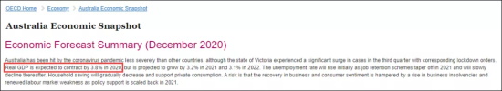 去年9月2日,澳大利亚统计局披露,该国GDP二季度环比缩水7%,达到1959年有记录以来的最大跌幅,连续两个季度出现GDP负增长,澳大利亚经济被澳《金融评论报》解读为“正式进入29年来的首次技术性衰退”。而到了去年12月,澳官方统计称,该国第三季度GDP增长3.3%,显示出了复苏势头。澳大利亚国库部长乔希·弗莱登伯格(Josh Frydenberg)还表示,本国经济已经结束了技术性衰退。据路透社3月2日报道,澳大利亚统计局当天披露称,该国第四季度GDP预计将增长2.5%,仍处于正增长状态。不过,正式统计数据仍未发布,将于近期正式公布。去年12月,经合组织(OECD)曾发布一份预测报告,其中指出,澳大利亚受新冠疫情的打击程度并不像其他国家那样严重,但2020年实际GDP预计将会萎缩3.8%。