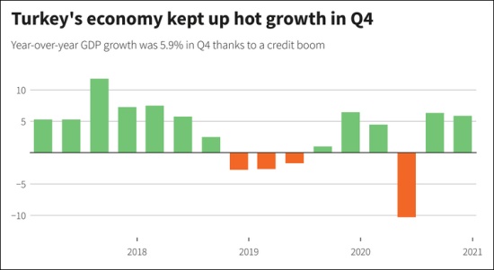 据路透社3月1日报道,土耳其官方当天公布的年度经济数据显示,该国2020年第四季度GDP增长5.9%,去年全年GDP增长1.8%,成为全球为数不多可以在疫情大流行中避免经济萎缩的国家之一。特别是去年下半年,土耳其GDP增长率大幅飙升,除了第四季度增长5.9%以外,第三季度更是同比增长6.7%。一大原因是土耳其的国有银行为抵御新冠疫情冲击,将贷款总额增加了近一倍。路透社指出,除去中国,土耳其的这一经济表现不仅好于所有新兴市场国家,还在G20中“鹤立鸡群”。