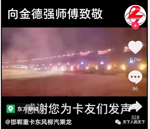 昨天,邯郸的一群卡车司机集体列队,亮灯鸣笛,向用生命为卡友们发声的金德强致敬。