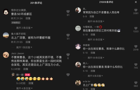 在网友的评论热潮中,有人追捧这句口号,是因为它“非常魔性”;有人厌恶这句口号,因为它“没有营养”;还有人是想借助曹县,解构北上广深的“繁荣虚像”……