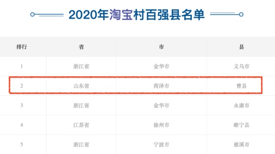在阿里发布的《2020年淘宝百强县名单》中,曹县也以17个淘宝镇、151个淘宝村的数量位列全国第二。