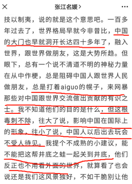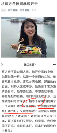 媚日恨国到如此程度,按理来说,最明智的选择就是低头认错,不过,指望公知低头认错显然是不可能的,事实上,公知不仅没有低头认错还成群结队的为蒋方舟洗地。如今天我就看到的一篇为蒋方舟洗地的名为《从蒋方舟被网暴说开去》的文章,文章说来说去,无非就是喜欢日本是蒋方舟的自由,赞美日本同样是蒋方舟的自由,如作者在文中就说“她喜欢日本也好,喜欢台湾也好,那是她的自由,别的人无权干涉……她等于帮咱们提供个了一个观察日本的全新视角。就算她写的都是日本的好,又能怎样呢?这就能证明她是被收买了才写的?”