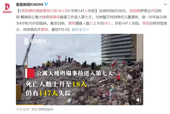 6月24日凌晨1点半,美国佛罗里达州迈阿密的一处高档海景公寓大楼突然倒塌。到今天,已经足足7天过去了,美国方面通报的数据是18人遇难,147人失踪。