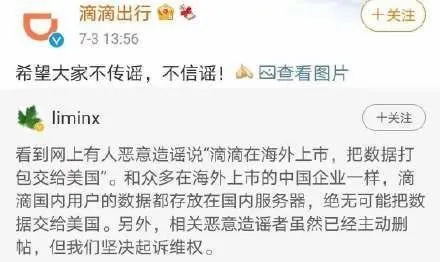 7月3日,滴滴官微发布称“滴滴把数据打包给美国”是谣言,还要起诉“恶意造谣”的自媒体;