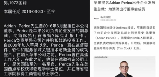 滴滴还有一处疑点,滴滴董事会有个独立董事叫Adrian perica,有美国陆军的服役经历,2016年就是独立董事了。该人曾经长期在苹果公司担任独立董事。