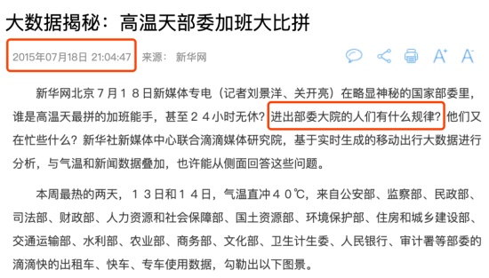 2015年,滴滴媒体研究院,联合新华网新媒体中心,发布了一份《高温天部委加班大比拼》。