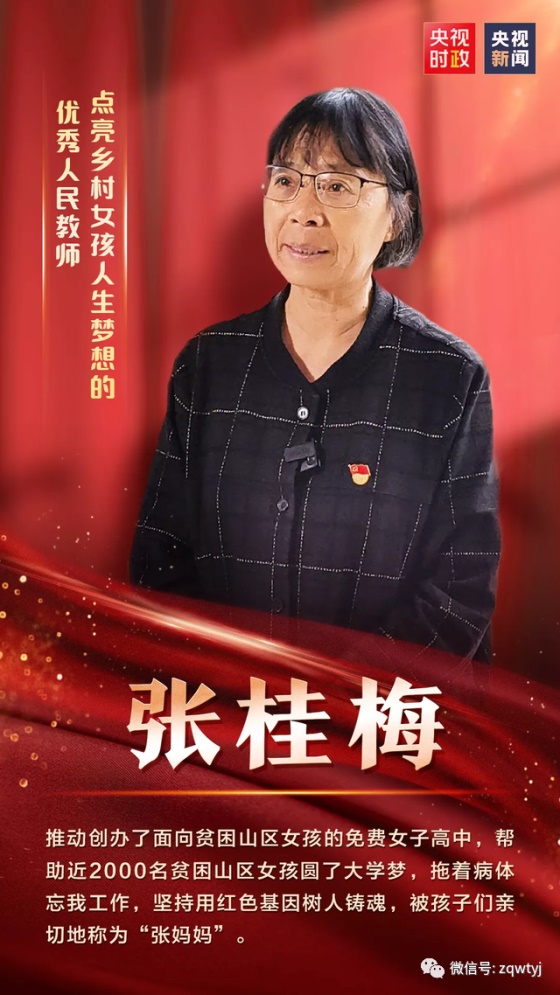 已经63岁的张桂梅,现为云南省丽江市华坪县女子高级中学党支部书记、校长,华坪县儿童福利院院长。作为一个从黑龙江省来扎根边疆云南的外省人,她长期献身民族地区教育事业,疾病缠身却奉献不止,教书育人,用爱心和智慧点亮大批乡村孩子的人生梦想,充分展现了当代人民教师的高尚师德。2008年以来,她已帮助1800多名女孩走出大山,用知识改变了贫困山区女孩命运,并先后获得“全国优秀教师”“全国三八红旗手”“云岭楷模”“全国教书育人楷模”“全国优秀共产党员”等荣誉称号。