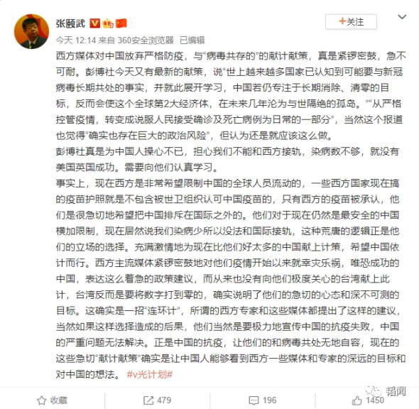 不过,在英国BBC、美国彭博社煽动中国要学会与病毒共存否则就会变成“孤岛”之前,非常著名的“网红”医生张文宏在7月29日就在个人微博中有过类似的论述。