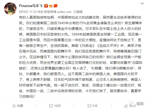知名博主@Finance鸟不飞 说的很有深度:中国拥有如此大的战略优势,居然要主动放弃?还有比这更愚蠢的建议吗?