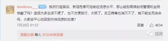 比如网民@idontknow___ 指出:既然打疫苗后,新冠危害可控制在流感水平,那么能别再搞封闭管理和全民核酸了吗?造成太多生活不便了,也不方便旅行,太烦了。反正病毒也消灭不了,就不能生死由命吗,大家放平心态回到对待流感的态度?