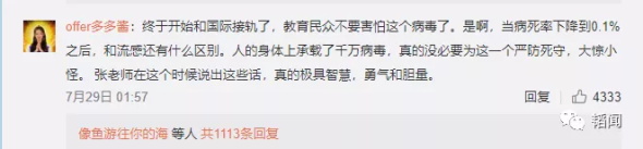 另一个网民@offer多多酱 则说:终于开始和国际接轨了,教育民众不要害怕这个病毒了。是啊,当病死率下降到0.1%之后,和流感还有什么区别。人的身体上承载了千万病毒,真的没必要为这一个严防死守,大惊小怪。张老师在这个时候说出这些话,真的极具智慧,勇气和胆量。