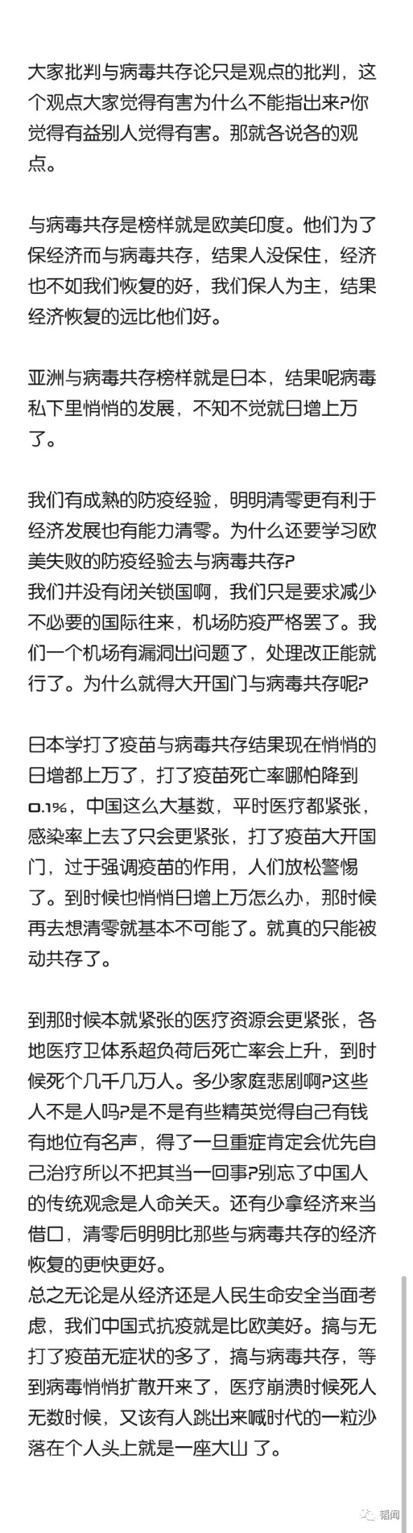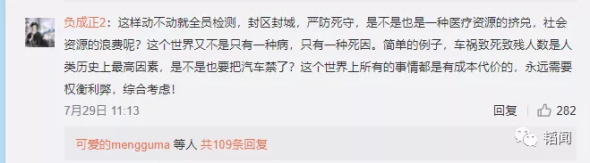 还有网民@负成正2 指出:这样动不动就全员检测,封区封城,严防死守,是不是也是一种医疗资源的挤兑,社会资源的浪费呢?这个世界又不是只有一种病,只有一种死因。简单的例子,车祸致死致残人数是人类历史上最高因素,是不是也要把汽车禁了?这个世界上所有的事情都是有成本代价的,永远需要权衡利弊,综合考虑!