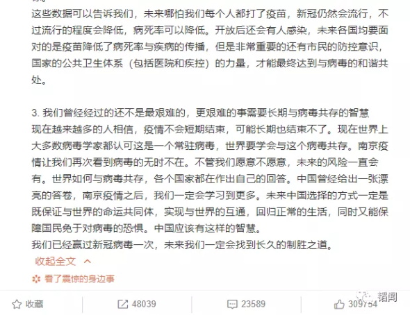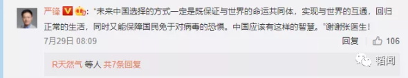 而非常知名的大V@严锋 则说:“未来中国选择的方式一定是既保证与世界的命运共同体,实现与世界的互通,回归正常的生活,同时又能保障国民免于对病毒的恐惧。中国应该有这样的智慧。”谢谢张医生!