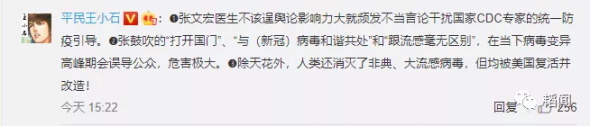 知名博主@平民王小石 说:❶张文宏医生不该逞舆论影响力大就频发不当言论干扰国家CDC专家的统一防疫引导。❷张鼓吹的“打开国门”、“与(新冠)病毒和谐共处”和“跟流感毫无区别”,在当下病毒变异高峰期会误导公众,危害极大。❸除天花外,人类还消灭了非典、大流感病毒,但均被美国复活并改造!