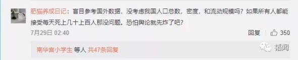 另一个网民@肥猫养成日记 则指出一系列的事实说:盲目参考国外数据,没考虑我国人口总数,密度,和流动规模吗?如果所有人都能接受每天死上几十上百人那没问题。恐怕舆论就先炸了吧?
