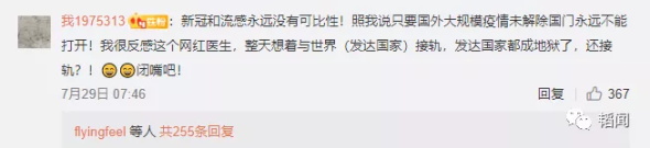 比如网民@我1975313 就直接怒批张文宏医生说:新冠和流感永远没有可比性!照我说只要国外大规模疫情未解除国门永远不能打开!我很反感这个网红医生,整天想着与世界(发达国家)接轨,发达国家都成地狱了,还接轨?!闭嘴吧!