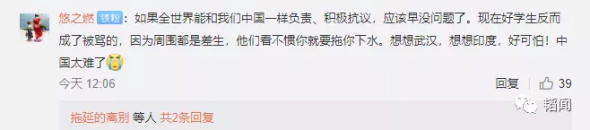 网民@悠之燃 指出:如果全世界能和我们中国一样负责、积极抗议,应该早没问题了。现在好学生反而成了被骂的,因为周围都是差生,他们看不惯你就要拖你下水。想想武汉,想想印度,好可怕!中国太难了[泪]