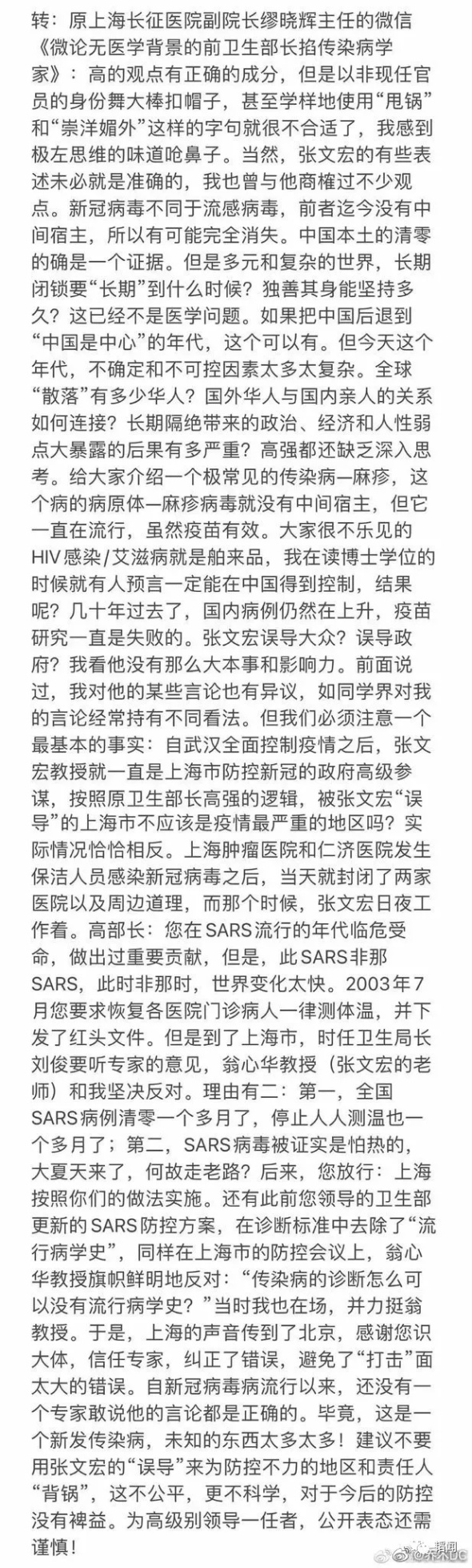然后,在网上就传出另一篇文章,称是原上海长征医院副院长缪晓辉主任的微信《微论无医学背景的前卫生部长掐传染病学家》。