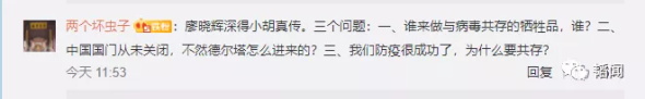 对此,网民@两个坏虫子 上来就指出:廖晓辉深得小胡真传。三个问题:一、谁来做与病毒共存的牺牲品,谁?二、中国国门从未关闭,不然德尔塔怎么进来的?三、我们防疫很成功了,为什么要共存?