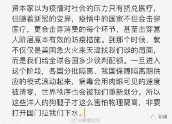 该截图中说:长期闭锁要“长期”到什么时候?独善其身能坚持多久?并称如果把中国后退到“中国是中心的年代可以,可是现在不行。”还称长期“隔绝”。