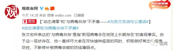 不过,在昨天,@观察者网 在微博上发了一篇文章并置顶 【“动态清零”和“与病毒共存”不矛盾——#为张文宏说句公道话#】
