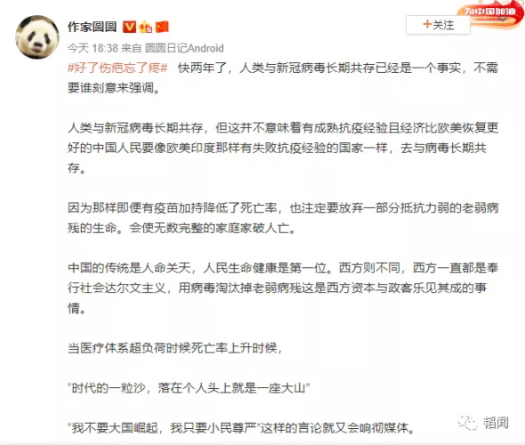 知名博主@作家圆圆 的帖子更深刻:#好了伤疤忘了疼# 快两年了,人类与新冠病毒长期共存已经是一个事实,不需要谁刻意来强调。