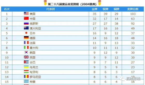 总体来说,中国金牌数增加,主要是乒乓、羽毛、双人跳水、女举陆续进入奥运,一共增加了17金之多。这是体育外交,促进男女平等、项目平等实现的。有这四个优势项目的25金,加入体操14金,射击12金,中国在这51金里面拼出20金不奇怪,前三实力就有底气了。2004年雅典奥运,美国共35金,是多届的最低值。其中田径8金、游泳12金;射击、体操各2金;女篮、女足、女沙排、女垒,四个团体金牌;拳击、跆拳道、摔跤、自行车、赛艇、帆船、击剑各1金。中国32金首次接近美国,虽然赛程上看没有机会,但是已经展示了挑战的潜力。美国也确立了“田径游泳主项发挥不佳,零星小项撑住金牌总数”的模式。游泳还是被澳大利亚挑战。日本16金发挥不错,是东京奥运之前的小高潮,90年代开始有一个运动热潮,足球等项目崛起。英国9金已经开始认真准备了。