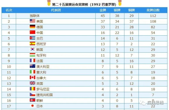这次被一记闷棍,才知道体育江湖不简单,想得金牌就得收集情报信息、扎实投入。1992年巴塞罗那奥运,独联体借着余威45金第一,美国37金第二,险胜两德统一后的33金。中国通过1990年北京亚运会全面梳理了各项目,16金第四开始显示潜力。