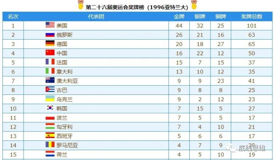 羽毛球进入奥运也有帮助,乒羽中心成为稳定的金牌来源。韩国维持地位,日本两届3-4金没什么实力,和英国一样都不太重视。小国古巴重视拳击等少数几项,可以14金冲到第五的可怕位次。总体来说,世界上比奥运会重要的事很多,各国普遍对于金牌都没有太多追求,主要还是几个有体系重视的国家表现好。随着冷战结束,局部战争数量大减,和平成为世界主流。奥运会和世界杯影响力逐渐扩大,各国的竞争开始脱离政治,奥运事业发展良好。1996亚特兰大奥运,美国主场44金第一。俄罗斯跌至26金,德国跌至20金,旧体制积累的优势在瓦解。中国维持16金第四,但与二三名接近了,逐渐有了“六大优势项目”的概念,知道科学投入了。