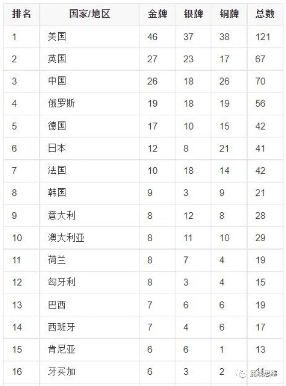 长期来说,如果运动成绩显著进步,就如中国从1988年5金进步到两届16金,再进步到30多金成为正常水准,这明显是国力进步带来的。美国总体来说,总是有30多金保底的实力,就算从40多金降到30多金,也是历史上不时发生的事,不能说代表国力衰退。杰出运动员退役,天才竞争对手涌现,是否本土作战,在异地是否水土不服,代表团成绩出现10金以上的波动,都是常见的事。我们可以观察到,美国体育运动的优势相对中国、相对世界,总体在缩小。这也是好事,说明中国和世界多国,在体育运动上不断吸收先进经验,有些经验就是从美国来的。各国天才不断打破世界纪录,创造出令人惊叹或不可思议的好成绩。2008年博尔特的横空出世就是好的例子,大大提升了田径运动的世界影响力。近年来世界田径高手大批涌现,日益分散在世界多国。同样的例子也发生在足球领域,世界多国的足球水平大幅提升,中国能轻松对付的球队越来越少。这都是好事。体育的事归体育,人类一起看奥运,为选手们的优秀成绩喝彩,为自己国家的选手加油,希望国家金牌多些,都是很正面的想法。将体育之外的竞争引入,有时能增加看点,但不宜喧宾夺主,还是应该以奥运精神为主线。另一方面,为国增光也是奥运的重要主题,不要因为政治扭曲,有好成绩还要硬去挑刺。(来源:昆仑策网【授权】,转编自“观察者网-底线思维”)【本公众号所编发文章欢迎转载,为尊重和维护原创权利,请转载时务必注明原创作者、来源网站和公众号。阅读更多文章,请点击微信号最后左下角“阅读原文”】