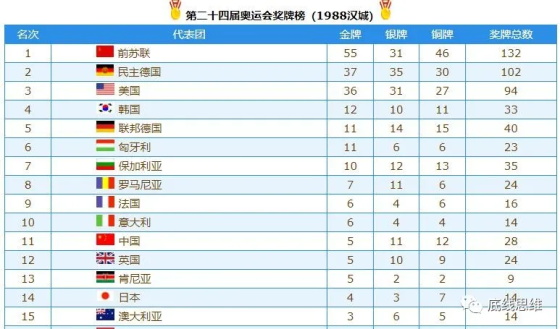 历史上看,1988年是现代奥运各国激烈竞争的真正起点。全球体育强国都参加了,中国也进来了,之后再没有主要大国退出的事。1988年汉城奥运会,还是美苏争霸,苏联55金榜首,美国36金甚至不如民主德国的37金。前三垄断太厉害,金牌总数也要少一些,后面各国金牌数量稀少。