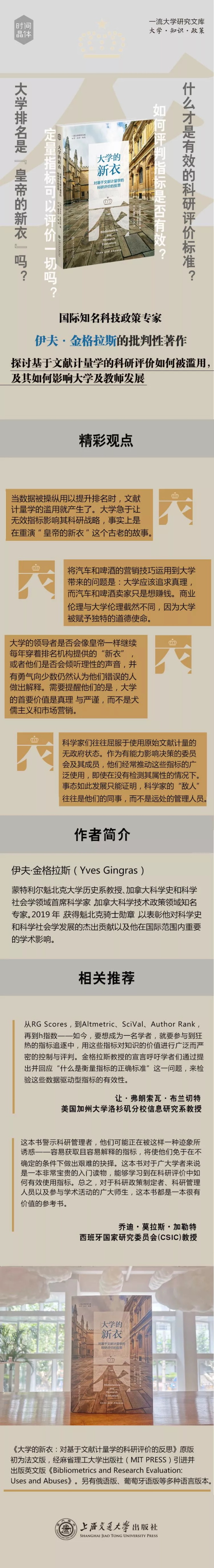 国际知名科技政策专家伊夫斯·金格拉斯的批判性著作《大学的新衣:对基于文献计量学的科研评价的反思》,围绕文献计量方法展开了热烈的讨论,通过聚焦评价的基本问题及其对科研的影响,厘清科研评价中很多似是而非的概念,帮助评价者和被评价者更合理地理解和使用目前在新兴的科研评价市场上盛行的排名“黑匣子”里的许多指标;同时也探究了大学急于让无效指标影响其科研战略的缘由,提出问题:尽管大多数的大学领导者、聪明的学者、有经验的管理人员认为排名并不具有科学价值,但他们仍然使用排名为其机构做宣传并应用于资源投入、教师聘任和晋升等重要战略决策,是否是在重演“皇帝的新衣”这个古老的故事?
